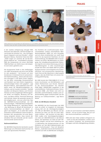 PRAXISFR%u00c4SEN BOHREN DREHEN STECHEN INDUSTRIENHaben gemeinsam das Schruppen bei HWS optimiert (v.l.): Lee Klappert, Beratung und Verkauf bei ISCAR, Benjamin Markus, Teamleiter Fr%u00e4sen bei HWS, und Marco R%u00f6tzel, Technische Beratung und Vertrieb bei ISCAR. In der zweiten Aufspannung schruppt HWS die Kontur der Oberseite, zeilt die Schr%u00e4gen ab und bringt die Schultern ein. %u201eDas Schruppen dauert insgesamt rund zwei Stunden%u201c, erkl%u00e4rt Benjamin Markus, Teamleiter Fr%u00e4sen bei HWS.%u201eDabei tragen wir zwischen 40 und 60 Kilogramm Material ab.%u201c Anschlie%u00dfend schlichtet HWS die Komponente mit einem HELITANG T490-Planfr%u00e4ser von ISACR, bevor die Keilplatte noch extern geh%u00e4rtet wird.Die Komponente findet in den Gie%u00dfanlagen von HWS Verwendung und wird rund 30 Mal im Jahr produziert %u2013 seit Kurzem auf einer brandneuen 5-Achsmaschine mit automatisiertem Palettenhandling. %u201eDamit w%u00e4re das mannlose Schruppen in die Nacht hinein m%u00f6glich, nur die daf%u00fcr notwendige Prozesssicherheit und Standzeit war beim bisher eingesetzten, sechsschneidigen Fr%u00e4ser nicht gegeben%u201c, sagt Benjamin Markus. %u201eNach sp%u00e4testens einer Keilplatte waren die Wendeschneidplatten verschlissen, und wir mussten sie drehen.%u201c Deshalb wandten sich Benjamin Markus und Christian Hammer an ihren langj%u00e4hrigen Werkzeugpartner ISCAR. Lee Klappert, Beratung und Verkauf, und Marco R%u00f6tzel, Technische Beratung und Vertrieb, hatten die passende L%u00f6sung f%u00fcr die Aufgabe parat: %u201eUns war sofort klar, dass der NEOFEED-Hochvorschubfr%u00e4ser mit den achtschneidigen FFQ8-Wendeschneidplatten das richtige Werkzeug ist%u201c, sagt Marco R%u00f6tzel.%u201eDas Werkzeug ist aktuell die Benchmark in Sachen Hochvorschubfr%u00e4ser am Markt%u201c, erg%u00e4nzt Lee Klappert. %u201eEs ist jedes Mal wieder erstaunlich wieviel Material unsere Kunden in k%u00fcrzester Zeit, prozesssicher mit einer Best%u00fcckung zerspanen k%u00f6nnen. Dazu kommt der attraktive Preis pro Schneide und der maschinenschonende weiche Schnitt.%u201c Hochvorschubfr%u00e4sen Die NEOFEED-Fr%u00e4serfamilie beinhaltet sowohl Werkzeuge zum effizienten Hochvorschub- als auch zum dynamischen Planfr%u00e4sen.Heinrich Wagner Sinto plante die Keilplatten f%u00fcr seine Formmaschinen mannlos nachts zu schruppen.Der bisher eingesetzte Fr%u00e4ser bot daf%u00fcr allerdings weder genug Standzeit noch ausreichende Prozesssicherheit.Der achtschneidige NEOFEED-Hochvorschubfr%u00e4ser von ISCAR war die L%u00f6sung. Damit kann das Unternehmen die Komponente jetzt nicht nur zuverl%u00e4ssig, sondern auch noch wirtschaftlicher bearbeiten.Der multifunktionalen Hochvorschubfr%u00e4ser NEOFEED wird mit wirtschaftlichen Wendeschneidplatten mit acht Schneiden best%u00fcckt und verf%u00fcgt zum Hochvorschubfr%u00e4sen %u00fcber einem Anstellwinkel von zw%u00f6lf Grad.SHORTCUTAUFGABE: Schruppen von Keilplatten aus legiertem Stahl L%u00d6SUNG: Hochvorschubfr%u00e4sen mit achtschneidigem NEOFEEDNUTZEN: Sicherer und wirtschaftlicher Prozess, lange StandzeitiDas Portfolio der multifunktionalen Hochvorschubfr%u00e4ser umfasst wirtschaftliche Wendeschneidplatten (WSP) mit acht Schneiden und mit einem Anstellwinkel von zw%u00f6lf Grad sowie f%u00fcr das dynamisch Planfr%u00e4sen mit 22,5 Grad Anstellung. Der NEOFEED steht in Durchmessern von 50 bis 100 Millimetern zur Verf%u00fcgung. Der schwalbenschwanz%u00e4hnliche Plattensitz sorgt f%u00fcr eine sichere Klemmung und hohe Oberfl%u00e4cheng%u00fcten. In allen Anwendungen erlaubt die dicke und stabile WSP ein gro%u00dfes Zeitspanvolumen und erm%u00f6glicht eine kosteneffiziente und prozesssichere Bearbeitung.Harte Tests auf den Maschinen in Bad Laasphe zeigten, dass das ISCAR-Team mit seinem Vorschlag goldrichtig lag.Bei HWS kommt der FFQ8 D080-07-27-12 mit einem Durchmesser von 80 Millimetern und sieben Plattensitzen zum Einsatz. Best%u00fcckt ist der Hochvorschubfr%u00e4ser mit robusten FFQ8 SZMU 120520T-WSP, ausgef%u00fchrt in der verschlei%u00dffesten TiAlN-beschichteten Feinstkornsorte IC808. %u201eDie Platten sind nicht nur besonders weichschneidend, sondern auch widerstandsf%u00e4hig gegen Kerbverschlei%u00df und die Bildung von Aufbauschneiden%u201c, sagt Marco R%u00f6tzel.Mehr als 200 Minuten StandzeitDer NEOFEED hat die Erwartungen bei HWS mehr als erf%u00fcllt. Im Vergleich zur bisherigen L%u00f6sung lie%u00df sich die Schnittgeschwindigkeit von 180 auf 200 Meter pro Minute und der Vorschub pro Zahn von 0,8 auf einen Millimeter erh%u00f6hen. %u201eWir konnten mit dem NEOFEED zudem eine Vorschubgeschwindigkeit von mehr als 5.500 Millimetern in der Minute fahren, die Spandicke von 0,69 auf 0,87 Millimeter steigern und bei einer Zustellung von 1,2 Millimetern das Zeitspanvolumen um das Dreifache auf fast 400 Kubikzentimeter pro Minute hochschrauben%u201c, freut sich Benjamin Markus. %u201eAu%u00dferdem hat sich die Standzeit prozesssicher auf mehr als 200 Minuten verdoppelt, so dass wir auch mannlos in die Nacht arbeiten k%u00f6nnen %u2013 da war es keine Frage, dass wir auf den Hochvorschubfr%u00e4ser umstellten.%u201cHWS setzt den Fr%u00e4ser seitdem erfolgreich ein %u2013 nicht nur bei den Keilplatten, sondern auchbei anderen Projekten, die prozesssicheresSchruppen und hohe Abtragleistung erfordern.Es entstehen saubere kurze Sp%u00e4ne, die sich einfach evakuieren lassen.17