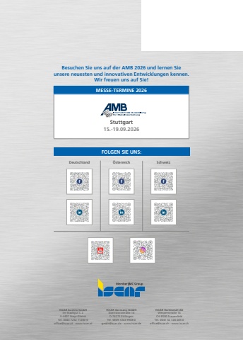 MESSE-TERMINE 202615.-19.09.2026StuttgartISCAR Germany GmbHEisenstockstra%u00dfe 14 D-76275 EttlingenTel. 0049 7243 9908-0 [email protected] %u00b7 www.iscar.deISCAR Austria GmbHIm Stadtgut C 2 A-4407 Steyr-GleinkTel. 0043 7252 71200-0 [email protected] %u00b7 www.iscar.atISCAR Hartmetall AGWespenstra%u00dfe 14 CH-8500 Frauenfeld Tel. 0041 52 728 085-0 [email protected] %u00b7 www.iscar.ch%u00d6sterreich SchweizFOLGEN SIE UNS:DeutschlandBesuchen Sie uns auf der AMB 2026 und lernen Sie unsere neuesten und innovativen Entwicklungen kennen. Wir freuen uns auf Sie!