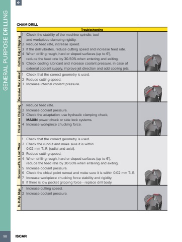 98 ISCAR GENERAL PURPOSE DRILLINGCHAM-DRILLTroubleshootingCutting Edge Chipping1 Check the stability of the machine spindle, tool and workpiece clamping rigidity.2 Reduce feed rate, increase speed.3 If the drill vibrates, reduce cutting speed and increase feed rate.4 When drilling rough, hard or sloped surfaces (up to 6%u00b0), reduce the feed rate by 30-50% when entering and exiting.5 Check cooling lubricant and increase coolant pressure. in case of external coolant supply, improve jet direction and add cooling jets.Excessive Flank Wear 1 Check that the correct geometry is used.2 Reduce cutting speed.3 Increase internal coolant pressure.Chisel Area Chipping1 Reduce feed rate.2 Increase coolant pressure.3 Check the adaptation. use hydraulic clamping chuck, MAXIN power chuck or side lock systems.4 Increase workpiece chucking force.Excessive Flute Land Wear1 Check that the correct geometry is used.2 Check the runout and make sure it is within 0.02 mm T.I.R. (radial and axial).3 Reduce cutting speed.4 When drilling rough, hard or sloped surfaces (up to 6%u00b0), reduce the feed rate by 30-50% when entering and exiting.5 Increase coolant pressure.6 Check the chisel point runout and make sure it is within 0.02 mm T.I.R.7 Increase workpiece chucking force stability and rigidity.8 If there is low pocket gripping force - replace drill body.Built-Up Edge1 Increase cutting speed.2 Increase coolant pressure.