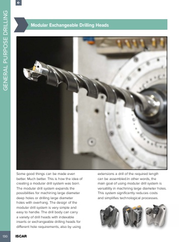 130 ISCAR GENERAL PURPOSE DRILLING %u00bd%u0009Modular Exchangeable Drilling HeadsSome good things can be made even better. Much better. This is how the idea of creating a modular drill system was born. The modular drill system expands the possibilities for machining large diameter deep holes or drilling large diameter holes with overhang. The design of the modular drill system is very simple and easy to handle. The drill body can carry a variety of drill heads with indexable inserts or exchangeable drilling heads for different hole requirements, also by using extensions a drill of the required length can be assembled.In other words, the main goal of using modular drill system is versatility in machining large diameter holes. This system significantly reduces costs and simplifies technological processes.