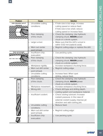 151GENERAL PURPOSE DRILLINGProblem Cause Solutionhole diameter out of tolerance%u2022 Unsuitable cutting conditions.%u2022 If hole size is too large, increase cutting speed or reduce feed. If hole size is too small, reduce cutting speed or increase feed.%u2022 Poor clamping of the chuck.%u2022 Check the clamping. Use hydraulic clamping chuck, MAXIN power chuck or a shrink system.%u2022 Large runout. %u2022 Make sure that the drill%u2019s runout is within 0.02 mm (radial & axial).%u2022 Worn out center point (chisel).%u2022 Regrind cutting edge or replace the drill.hole not straight %u2022 Insufficient chip evacuation.%u2022 Use pecking cycle.%u2022 Poor clamping of the chuck.%u2022 Check the clamping. Use hydraulic clamping chuck, MAXIN power chuck or a shrink system. %u2022 Workpiece rigidity. %u2022 Increase workpiece chucking force.%u2022 Worn out drill center point (chisel).%u2022 Regrind cutting edge.%u2022 Unsuitable cutting conditions.%u2022 Increase feed. When spot drilling, reduce feed.drill breakage %u2022 Poor clamping of the chuck.%u2022 Check the clamping. Use hydraulic clamping chuck, MAXIN power chuck or a shrink system. %u2022 Workpiece movement. %u2022 Increase workpiece chucking force.%u2022 Wrong drill. %u2022 Check drill type and drilling depth, cooling system and workpiece material.%u2022 Insufficient coolant. %u2022 Check cooling lubricant. Increase coolant pressure. In the case of external coolant supply, improve jet direction and add cooling jets.%u2022 Unsuitable cutting conditions.%u2022 Reduce feed.%u2022 Worn out drill center point (chisel).%u2022 Regrind cutting edge.%u2022 Insufficient chip evacuation.%u2022 Use pecking cycle.