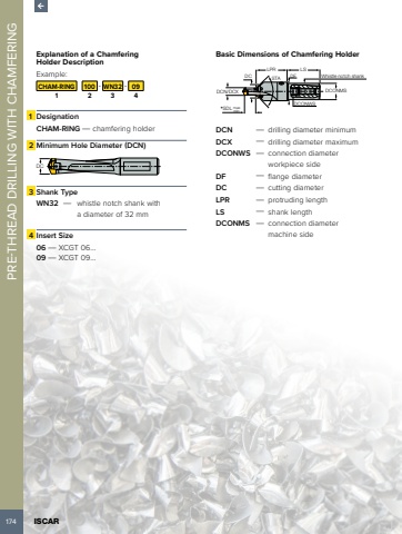 174 ISCAR PRE-THREAD DRILLING WITH CHAMFERING Explanation of a Chamfering Holder Description Example:CHAM-RING 100 - WN32 - 091 2 3 41 DesignationCHAM-RING %u2014 chamfering holder 2 Minimum Hole Diameter (DCN)DC 3 Shank TypeWN32 %u2014 whistle notch shank with a diameter of 32 mm4 Insert Size06 %u2014 XCGT 06%u202609 %u2014 XCGT 09%u2026Basic Dimensions of Chamfering HolderLPR LSDFDCONWSDCONMSSTA DCDCN/DCXWhistle notch shank*SDL max minDCN %u2014 drilling diameter minimumDCX %u2014 drilling diameter maximumDCONWS %u2014 connection diameter workpiece sideDF %u2014 flange diameterDC %u2014 cutting diameterLPR %u2014 protruding lengthLS %u2014 shank lengthDCONMS %u2014 connection diameter machine side