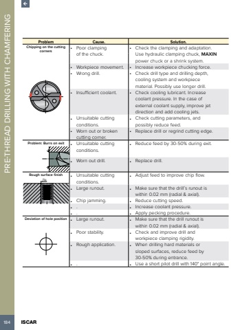 184 ISCAR PRE-THREAD DRILLING WITH CHAMFERING Problem Cause. Solution.Chipping on the cutting corners %u2022 Poor clamping of the chuck.%u2022 Check the clamping and adaptation. Use hydraulic clamping chuck, MAXINpower chuck or a shrink system.%u2022 Workpiece movement. %u2022 Increase workpiece chucking force.%u2022 Wrong drill. %u2022 Check drill type and drilling depth, cooling system and workpiece material. Possibly use longer drill.%u2022 Insufficient coolant. %u2022 Check cooling lubricant. Increase coolant pressure. In the case of external coolant supply, improve jet direction and add cooling jets.%u2022 Unsuitable cutting conditions.%u2022 Check cutting parameters, and possibly reduce feed.%u2022 Worn out or broken cutting corner.%u2022 Replace drill or regrind cutting edge.Problem: Burrs on exit %u2022 Unsuitable cutting conditions.%u2022 Reduce feed by 30-50% during exit.%u2022 Worn out drill. %u2022 Replace drill.Rough surface finish %u2022 Unsuitable cutting conditions.%u2022 Adjust feed to improve chip flow.Ra%u2022 Large runout. %u2022 Make sure that the drill%u2019s runout is within 0.02 mm (radial & axial).%u2022 Chip jamming. %u2022 Reduce cutting speed.%u2022 . %u2022 Increase coolant pressure.%u2022 . %u2022 Apply pecking procedure.Deviation of hole position %u2022 Large runout. %u2022 Make sure that the drill runout is within 0.02 mm (radial & axial).%u2022 Poor stability. %u2022 Check and improve drill and workpiece clamping rigidity.%u2022 Rough application. %u2022 When drilling hard materials or sloped surfaces, reduce feed by 30-50% during entrance.%u2022 . %u2022 Use a short pilot drill with 140%u00b0 point angle.