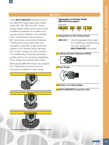 195SPOT DRILLING AND CHAMFERINGMM HCDIn the MULTI-MASTER standard product line, MM HCD heads have point angles of 60%u00b0, 80%u00b0, 90%u00b0, 100%u00b0 and 120%u00b0. Such a variety relates mainly to the requirements of different standards for chamfers and countersinks for fasteners. For example, metric countersunk screws require a 90%u00b0 countersink, but American National countersunk screws require 80%u00b0 and aerospace rivets 100%u00b0. A typical chamfer features a 45%u00b0 chamfer angle, although 30%u00b0 and 60%u00b0 chamfers are also common. This multiformity of required generated profiles defines the functional capabilities of the heads and explains their variety.Although the MM HCD head was designed for a moderated chip load, this tool may also be suitable for spot drilling.ChamferingDrillingCountersinkingExplanation of Drilling Heads MM HCD Description Example:MM HCD 100 - 120 - 2 T061 2 3 4 51 Designation of the Drilling HeadMM HCD %u2013 interchangeable 2 flute head for chamfering, countersinking and spot drilling with MULTI-MASTER connection2 Cutting Diameter Maximum (DCX)DCX3 Point Angle140%u00b0DC4 Number of Cutting Edges5 MULTI-MASTER Connection Size
