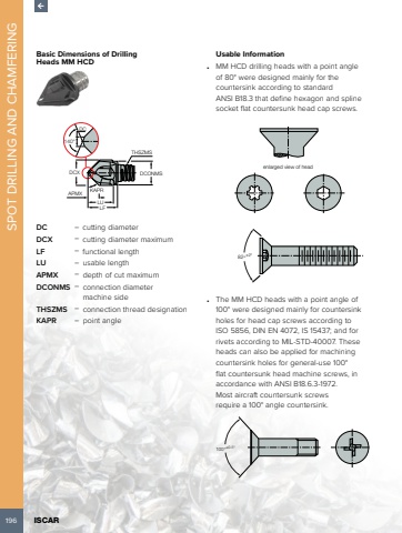 196 ISCAR SPOT DRILLING AND CHAMFERINGBasic Dimensions of Drilling Heads MM HCD140%u00b0DCDCONMSLFAPMX KAPRLUDCXTHSZMSDC %u2013 cutting diameterDCX %u2013 cutting diameter maximumLF %u2013 functional lengthLU %u2013 usable lengthAPMX %u2013 depth of cut maximumDCONMS %u2013 connection diameter machine sideTHSZMS %u2013 connection thread designationKAPR %u2013 point angleUsable Information%u2022 MM HCD drilling heads with a point angle of 80%u00b0 were designed mainly for the countersink according to standard ANSI B18.3 that define hexagon and spline socket flat countersunk head cap screws.82%u00b0%u00b12%u00baenlarged view of head82%u00b0%u00b12%u00baenlarged view of head%u2022 The MM HCD heads with a point angle of 100%u00b0 were designed mainly for countersink holes for head cap screws according to ISO 5856, DIN EN 4072, IS 15437; and for rivets according to MIL-STD-40007. These heads can also be applied for machining countersink holes for general-use 100%u00b0 flat countersunk head machine screws, in accordance with ANSI B18.6.3-1972. Most aircraft countersunk screws require a 100%u00b0 angle countersink.100%u00b0%u00b10.5%u00ba