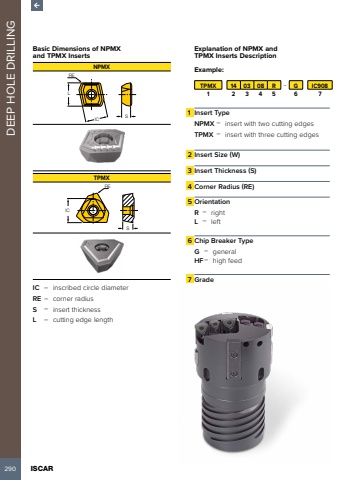 290 ISCAR DEEP HOLE DRILLINGBasic Dimensions of NPMX and TPMX InsertsNPMXICLRESTPMXICSRERGIC %u2013 inscribed circle diameterRE %u2013 corner radiusS %u2013 insert thicknessL %u2013 cutting edge lengthExplanation of NPMX and TPMX Inserts DescriptionExample:TPMX 14 03 08 R %u2013 G IC9081 2 3 4 5 6 71 Insert TypeNPMX %u2013 insert with two cutting edgesTPMX %u2013 insert with three cutting edges2 Insert Size (W)3 Insert Thickness (S)4 Corner Radius (RE)5 OrientationR %u2013 rightL %u2013 left6 Chip Breaker TypeG %u2013 generalHF%u2013 high feed7 Grade
