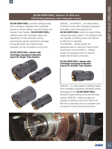291DEEP HOLE DRILLINGISCAR-DEEP-DRILL Solution for BTA and DTS Drilling Methods with Indexable InsertsISCAR-DEEP-DRILL includes drilling heads with cartridges equipped with indexable inserts for deep drilling using the Single and Double Tube System. ISCAR-DEEP-DRILLdrilling heads with cartridges allow fine adjustment of tool diameter and by exchanging only the peripheral cartridge and guide pads, the original head diameter can be increased up to 5 mm.ISCAR-DEEP-DRILL Heads with Cartridges Equipped Indexable Insert for Single Tube SystemDSD-EC%u2026 and DSD-IC%u2026 are descriptions of drilling heads with cartridges equipped indexable insert belonging to the ISCAR-DEEP-DRILL family for deep drilling using single tube system. The drilling heads are capable of drilling holes from 38 mm to 294 mm in diameter. The DSD-EC%u2026 drilling heads are designed with an external 4 start thread connection and the DSD-IC%u2026 drilling heads are designed with an internal single start thread connection.ISCAR-DEEP-DRILL Heads with Cartridges Equipped Indexable Inserts for Double Tube SystemDDD-EC%u2026 is a description of drilling heads with cartridges equipped indexable inserts belonging to the ISCAR-DEEP-DRILLfamily for deep drilling using double tube system. DDD-EC%u2026 drilling heads are capable of drilling holes from 38 mm to 184 mm in diameter and are available with an external 4 start thread connection.