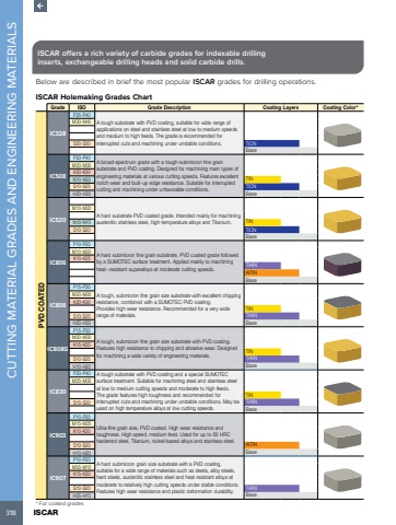 318 ISCAR CUTTING MATERIAL GRADES AND ENGINEERING MATERIALSISCAR offers a rich variety of carbide grades for indexable drilling inserts, exchangeable drilling heads and solid carbide drills.Below are described in brief the most popular ISCAR grades for drilling operations.ISCAR Holemaking Grades ChartGrade ISO Grade Description Coating Layers Coating Color*PVD COATEDIC328P25-P40A tough substrate with PVD coating, suitable for wide range of applications on steel and stainless steel at low to medium speeds and medium to high feeds. The grade is recommended for interrupted cuts and machining under unstable conditions.M30-M40S20-S30 TiCNBaseIC508P20-P40A broad-spectrum grade with a tough-submicron fine grain substrate and PVD coating. Designed for machining main types of engineering materials at various cutting speeds. Features excellent notch wear and built-up edge resistance. Suitable for interrupted cutting and machining under unfavorable conditions.M20-M30K20-K30N10-N30 TiNS10-S25 TiCNH20-H30 BaseIC520 A hard substrate PVD coated grade. Intended mainly for machining austenitic stainless steel, high-temperature alloys and Titanium.M10-M20N10-N15 TiNS10-S20 TiCNBaseIC806P10-P20A hard submicron fine grain substrate, PVD coated grade followed by a SUMOTEC surface treatment. Applied mainly to machining heat- resistant superalloys at moderate cutting speeds.M10-M20K10-K25TiAINAlTiNBaseIC808P15-P30A tough, submicron fine grain size substrate with excellent chipping resistance, combined with a SUMOTEC PVD coating. Provides high wear resistance. Recommended for a very wide range of materials.M20-M30K20-K30TiNS10-S25 TiAINH20-H30 BaseIC808GP15-P30A tough, submicron fine grain size substrate with PVD coating. Features high resistance to chipping and abrasive wear. Designed for machining a wide variety of engineering materials.M20-M30K15-K25TiNS10-S25 TiAlNH10-H20 BaseIC830P20-P40 A tough substrate with PVD coating and a special SUMOTEC surface treatment. Suitable for machining steel and stainless steel at low to medium cutting speeds and moderate to high feeds. The grade features high toughness and recommended for interrupted cuts and machining under unstable conditions. May be used on high temperature alloys at low cutting speeds.M25-M35TiNS15-S30 TiAlNBaseIC903P10-P20Ultra-fine grain size, PVD coated. High wear resistance and toughness. High speed, medium feed. Used for up to 62 HRC hardened steel, Titanium, nickel-based alloys and stainless steel.M15-M25K10-K20S10-S20 AlTiNH10-H20 BaseIC907P10-P20A hard submicron grain size substrate with a PVD coating, suitable for a wide range of materials such as steels, alloy steels, hard steels, austenitic stainless steel and heat resistant alloys at moderate to relatively high cutting speeds under stable conditions. Features high wear resistance and plastic deformation durability.M05-M15K15-K30S10-S20 TiAlNH05-H15 Base* For coated grades