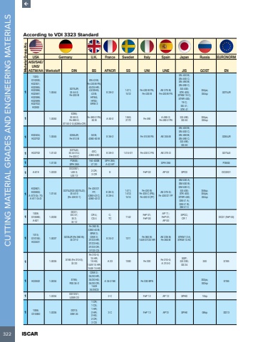 322 ISCAR CUTTING MATERIAL GRADES AND ENGINEERING MATERIALSAccording to VDI 3323 Standard Material Group No.USA Germany U.K. France Sweden Italy Spain Japan Russia EURONORMAISI/SAE/UNS/ASTM/AA Werkstoff DIN BS AFNOR SS UNI UNE JIS GOST EN11020;G10200;K02301;K02595;K02596;K02597;K02598;K02599;K02702;K03001.0044S275JR;St 44-2;Fe 430 BEN 43 B;Fe 430 B FN;43/25 HR;43/25HS;43 B;HFW4;HFS4;ERW 3E 28-2 1411;1412Fe 430 B FN;Fe 430 BAE 275 B;Fe 430 B FNSN 400 B;SN 400 C;SN 490 B;SN 490 C;SS 400;STK 400;STKM 19 C;STKR 400;19 C;SS 41;STK 41St4ps;St4sp S275JR1 1.0050E295;St 50-2;Fe 490-2;ST 50-2 G (E295+CR)Fe 490-2 FN;50 B A 50-2 1550;2172 Fe 490 A 490-2;Fe 490-2 FNSS 490;SS 50St5ps;St5sp1 K02404;K02702 1.0045 S355JR;Fe 510 B50 B;4360-50 B E 36-2 Fe 510 B FN AE 355 BSN 400 B;SN 400 C;SN 490 B;SN 490 C;SS 490;SS 50S355JR1 K02702 1.0143S275J0;St 44-3 U;Fe 430 C43C;4360-43C E 28-3 1414-01 Fe 430 C FN AE 275 D S275J01 1.0130 P265S;SPH 265164-400B LT 20SPH 265;A 42 AP SPH 265 P265S1 A 619 1.0333DC03G1;USt 3;USt 132 CR;3 CR E FeP 02 AP 02 SPCD DC03G11K02601;K03000;A 573 Gr. 70;A 611 Gr.D1.0144S275J2G3 (S275J2);St 44-3 (Fe 430 D 1)Fe 430 D1 FF;4360-43 C;4360-43 DE 28-3;E 28-41411;1412;1414Fe 430 B;Fe 430 C (FN);Fe 430 D (FF)AE 275 D;Fe 430 D1 FFSM 400 A;SM 400 B;SM 400 C;SS 400;STK 400;STKR 400;SM 41 A;SM 41 B;SM 41 CSt4kp;St4ps;St4sp11008;G10080;A 6211.0330DC01;DC 01;St 2;St 12CR 4;CS 4C;TC 1142 FeP 01;FeP 00AP 11;FeP 01;AP 00SPCC;CR 1 DC01 (FeP 05)11015;G10150;K024011.0037 S235JR (Fe 360 B);St 37-2Fe 360 B;4360-40 B;ERW 3;CEW 3;37/23 HR;37/23 HS;37/23 CR;37/23 CSE 24-2 1311 Fe 360 B;1449 37/23 HRAE 235 B;Fe 360 BSTKM 12 A;STKM 12 AC1 1.0035 S185 (Fe 310-0);St 33Fe 310-0;15 HR;15 HS;1449 15 HR;1449 15 HSA 33 1300 Fe 320 Fe 310-0;A 310-0SGP;SS 330;SS 34St0 S1851 K02502 1.0034 E195;RSt 34-2CEW 2;34/20 HR;34/20 HS;34/20 CR;1449 34/20CSA 34-2 NE Fe 330 BFN St2ps;St2sp E1951 1.0334 DD12G1;UStW 23 2 C FeP 12 AP 12 SPHD 10kp1 1006;G10060 1.0335 DD13;StW 241 CR;1 CS;1 HR;2 HR;2 HS;2 CR;2 CS3 C FeP 13 AP13 SPHE 08kp DD13