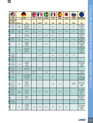 345CUTTING MATERIAL GRADES AND ENGINEERING MATERIALS Material Group No.USA Germany U.K. France Sweden Italy Spain Japan Russia EURONORMAISI/SAE/UNS/ASTM/AA Werkstoff DIN BS AFNOR SS UNI UNE JIS GOST EN22AA7075;A97075;70753.4365;3.4364AlZn5,5MgCu;AlZn5.5MgCu;AlZnMgCu1,5;AlZnMgCu1.57075;L95;L96A-Z5GU 9007/2 L-3710 A7075 B95AlZn5.5MgCu;AlZn5,.5MgCu;AW-7075;707522AA2024;A92024;20243.1355;3.1354 AlCuMg2 2024;2L97 A-U4G1 9002/4;3583 L-3140 A2024 D16 AlCu4Mg1;202422 3.4335 AlZn4,5Mg1;AlZn4.5Mg1 H17 A-Z5G 144425 9007/1 L-3741AlZn4.5Mg1;AlZn4,5Mg1;702022AA6061;A96061;60613.3211;3.3214 AlMg1SiCu H20 A-GSUC 9006/2 L-3420 A6061 AD33EN AW-6061;EN AW-AlMg1SiCu;AlMg1SiCu23 3.3261G-AlMg5Si;GK-AlMg5Si;AlMg5Si;VDS 245LM5 144163 AL13EN AC-51400;EN AC-AlMg5Si;G-AlMg5Si;AlMg5Si23 3.2982GD-AlSi12(Cu);G-AlSi12(Cu);AlSi12(Cu);VDS 231 DA-S12U 3048EN AC-47100;EN AC-AlSi12C;G-AlSi12Cu;AlSi12Cu;AlSi12Cu1(Fe)23520.0;AA 520.0;A05200A-G10S 3056 L-2310 AC7B A1823222.0;AA 222.0;A02220LM12 3041 L-211023518.0;AA 518.0;A051803.3292G-AlMg9;GD-AlMg9;AlMg9;VDS 349EN AC-51200;EN AC-AlMg9;G-AlMg9;AlMg923203.0;AA 203.0;A020303.1754 G-AICu5Ni1,5;G-AICu5Ni1.5 AU5NKZr23 ER4047;A94047 3.2585 SG-AlSi12 4047A;NG2 144262 SG-AlSi12;EL-AlSi1223712.0;AA 712.0;A07120G-AlZn10Si8Mg;GK-AlZn10Si8Mg;AlZn10Si8Mg;VDS 108A-Z5GF 3602EN AC-71100;EN AC-AlZn10Si8Mg;G-AlZn10Si8Mg;AlZn10Si8Mg23514.0;514.1;AA 514.0;AA 514.1;A05140;A051413.3561G-AlMg5;GK-AlMg5;AlMg5;EN AC-51300;VDS 244A-G6 3058 L-2331AL28;AMg5Mz;EN AC-51300;EN AC-AlMg5;G-AlMg5;AlMg523B413.0;AA B413.0;A24130;B213.0;AA 213.0;A221303.2581;3,2582G-AlSi12;GK-AlSi12;GD-AlSi12;AlSi12LM6 A-S13 144261 4514 L-2520 AC3EN AC-44200;EN AC-AlSi12;G-AlSi12;GD-AlSi12;AlSi1223 3.2211G-AlSi11;GK-AlSi11;AlSi11EN AC-44000;EN AC-AlSi11;G-AlSi1123A444.0;AA A444.0;A14440AK723 3.3541G-AlMg3;GK-AlMg3;GF-AlMg3;AlMg3;VDC 244H20 A-G3T 144224 3059 L-2341 ADC6EN AC-51100;EN AC-AlMg3;G-AlMg3;AlMg3