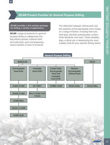 47GENERAL PURPOSE DRILLING%u00bd%u0009ISCAR Product Families for General Purpose DrillingISCAR provides a full solution package for drilling a variety of applications ISCAR%u2019s range of products for generalpurpose drilling is categorized into two primary groups: modular tools and solid tools, each encompassing various families or lines of products.The distinction between drilling tools and the selection of the appropriate one's hinges on a range of factors, including hole size, hole type, precision prerequisites, surface finish demands, and more. These variables play a critical role in determining the most suitable tools for your specific drilling needs.General Purpose DrillingMODULARExchangeable Head DrillsIndexable Insert DrillsCombo Drills,ExchangeableHead andIndexableInsert DrillsModularExchangeable Drilling HeadsSUMO-CHAM DR-TWIST COMBI-CHAM MODU-DRILLSPADE-CHAM MULTI-FUNCTION TOOLSCHAM-DRILLQUICK-3-CHAMSUMO-GUNSOLIDSOLID-DRILL