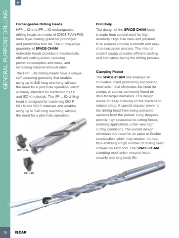 78 ISCAR GENERAL PURPOSE DRILLINGExchangeable Drilling HeadsHFP %u2026-IQ and IFP %u2026-IQ exchangeable drilling heads are made of IC908 TiAlN PVD nano layer coating grade for prolonged and predictable tool life. The cutting-edge geometry of SPADE-CHAMindexable heads provides a mechanically efficient cutting action, reducing power consumption and noise, and increasing material-removal rates. The HFP %u2026-IQ drilling heads have a unique self-centering geometry that enables using up to 8xD long overhang without the need for a pilot hole operation, which is mainly intended for machining ISO P and ISO K materials. The IFP %u2026-IQ drilling head is designed for machining ISO P, ISO M and ISO S materials and enables using up to 5xD long overhang without the need for a pilot hole operation. HFP ...-IQIFP ...-IQDrill BodyThe design of the SPADE-CHAM body is made from special steel for high durability. High flute helix and polished flute surfaces provide a smooth and easy chip evacuation process. The internal coolant supply provides efficient cooling and lubrication during the drilling process.Clamping PocketThe SPADE-CHAM line employs an innovative insert positioning and locking mechanism that eliminates the need for clamps or screws commonly found on drills for larger diameters. This design allows for easy indexing on the machine to reduce setup. A special stopper prevents the drilling head from being extracted upwards from the pocket. Long stoppers provide high resistance to cutting forces, enabling applications under very high cutting conditions. The pocket design eliminates the need for an open or flexible construction, which may weaken the tool, thus enabling a high number of drilling head indexes on each tool. The SPADE-CHAMclamping mechanism ensures insert security and long body life.