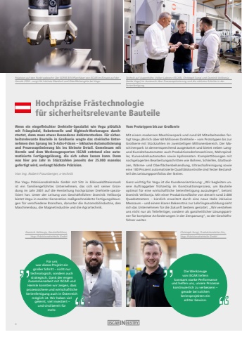Hochpr%u00e4zise Fr%u00e4stechnologie f%u00fcr sicherheitsrelevante BauteileWenn ein eingefleischter Drehteile-Spezialist wie Vegu pl%u00f6tzlichmit Fr%u00e4sspindel, Roboterzelle und Hightech-Werkzeugen durchstartet, dann muss etwas Besonderes dahinterstecken. F%u00fcr sicherheitsrelevante Bauteile in Gro%u00dfserie wagte das steirische Unternehmen den Sprung ins 5-Achs-Fr%u00e4sen %u2013 inklusive Automatisierung und Prozessoptimierung bis ins kleinste Detail. Gemeinsam mitHermle und dem Werkzeugexperten ISCAR entstand eine automatisierte Fertigungsl%u00f6sung, die sich sehen lassen kann. Dennwas hier pro Jahr in St%u00fcckzahlen jenseits der 25.000 mannlosgefertigt wird, verlangt h%u00f6chste Pr%u00e4zision.Von Ing. Robert Fraunberger, x-technikDie Vegu Pr%u00e4zisionsdrehteile GmbH mit Sitz in Eibiswald/Steiermark ist ein familiengef%u00fchrtes Unternehmen, das sich seit seiner Gr%u00fcndung im Jahr 2001 auf die Herstellung hochpr%u00e4ziser Drehteile spezialisiert hat. Unter der Leitung von Gesch%u00e4ftsf%u00fchrer Dominik Velikonja bietet Vegu in zweiter Generation ma%u00dfgeschneiderte Fertigungsl%u00f6sungen f%u00fcr verschiedene Branchen, darunter die Automobilindustrie, den Maschinenbau, die Magnetindustrie und die Agrartechnik.Vom Prototypen bis zur Gro%u00dfserieMit einem modernen Maschinenpark und rund 60 Mitarbeitenden fertigt Vegu j%u00e4hrlich %u00fcber 60 Millionen Drehteile %u2013 vom Prototypen bis zur Gro%u00dfserie mit St%u00fcckzahlen im zweistelligen Millionenbereich. Der Maschinenpark ist dementsprechend ausgestattet und bietet neben Langund Kurzdrehautomaten auch Produktionsdrehmaschinen, Mehrspindler, Kurvendrehautomaten sowie Hydromaten. Komplettl%u00f6sungen mit nachgelagerten Bearbeitungsschritten wie Bohren, Schleifen, Glattwalzen, W%u00e4rme- und Oberfl%u00e4chenbehandlung, Ultraschallreinigung sowie eine 100 Prozent automatisierte Qualit%u00e4tskontrolle sind fester Bestandteil des Leistungsportfolios der Steirer.Ganz wichtig f%u00fcr Vegu ist die Kundenorientierung: %u201eWir begleiten unsere Auftraggeber fr%u00fchzeitig im Konstruktionsprozess, um Bauteile optimal f%u00fcr eine wirtschaftliche Serienfertigung auszulegen%u201c, betont Dominik Velikonja. Mit einer Produktionsfl%u00e4che von derzeit rund 2.600 Quadratmetern %u2013 k%u00fcrzlich erweitert durch eine neue Halle inklusive Messraum %u2013 und einem klaren Bekenntnis zur Lehrlingsausbildung sieht sich das Unternehmen f%u00fcr die Zukunft bestens ger%u00fcstet. %u201eWir verstehen uns nicht nur als Teilefertiger, sondern als ganzheitlicher L%u00f6sungspartner f%u00fcr komplexe Anforderungen in der Zerspanung%u201c, so der Gesch%u00e4ftsf%u00fchrer weiter.Pr%u00e4zision auf den Punkt gebracht: Der SOF45 8/16 Planfr%u00e4ser von ISCAR im Einsatz auf der Hermle C250 %u2013 sorgt f%u00fcr h%u00f6chste Ebenheit und Oberfl%u00e4cheng%u00fcte bei Vegu.Dominik Velikonja, Gesch%u00e4ftsf%u00fchrer, Vegu Pr%u00e4zisionsdrehteile GmbH Christoph Sungi, Produktionsleiter-Stv., Vegu Pr%u00e4zisionsdrehteile GmbH F%u00fcr uns war dieses Projekt ein gro%u00dfer Schritt %u2013 nicht nur technologisch, sondern auch strategisch. Dank der engen Zusammenarbeit mit ISCAR und Hermle konnten wir zeigen, dass prozesssichere und wirtschaftliche Serienfertigung auch in %u00d6sterreich m%u00f6glich ist. Wir haben viel gelernt, viel investiert %u2013und sind bereit f%u00fcr mehr.Die Werkzeuge von ISCAR liefern konstant starke Performance und helfen uns, unsere Prozesse kontinuierlich zu verbessern %u2013 gerade bei solchen Serienprojekten ein echter Gewinn.Technik auf Augenh%u00f6he: Volker Labrenz (ISCAR), Christoph Sungi und Dominik Velikonja (beide Vegu) im Austausch %u00fcber Prozessoptimierung und die n%u00e4chsten Schritte in der Serienfertigung.6