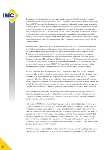 foregoing laws and sanction programs, no IMC Member may engage in any transaction or conduct of the type